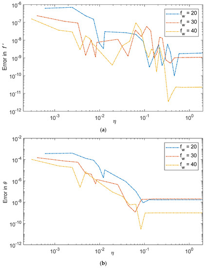For comparison purposes, Figure 5 presents the error in the velocity Figure 5a and temperature Figure 5b solutions at different values of the suction parameter , considering our reference solution is that obtained using the adaptive finite difference collocation method (Matlab BVP4C) at . The results confirm that the present IASM is efficient and results in a highly accurate solution.