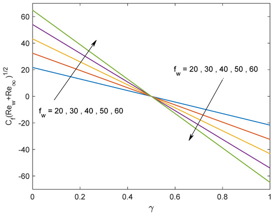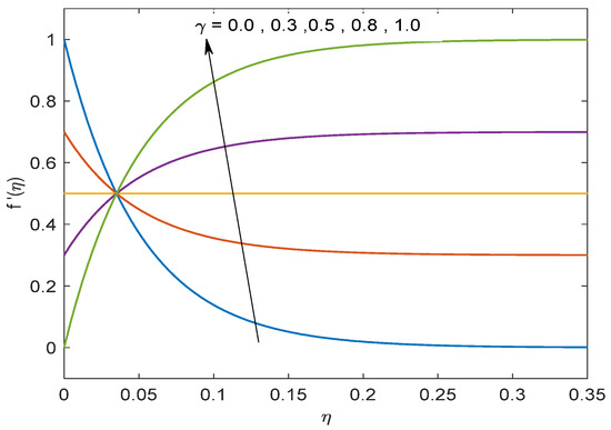 where primes denote the differentiation with respect to η, stands for the suction parameter. indicates the velocity ratio parameter. indicates the magnetic field parameter. indicates the Eckert number, , stand for local Reynolds numbers, gives the Prantdl number, indicates the kinematic viscosity of base fluid, and αf indicates the thermal diffusivity. It is noted that the suction parameter fw= 0 (Vw = 0) indicates a nonporous surface, whilst fw < 0 (Vw > 0) indicates the injection case and fw > 0 (Vw < 0) indicates the suction case (current work). It is also fascinating to state that the velocity ratio parameter γ = 0 and 1 elucidate a fixed surface in a moving liquid and a moving surface in a quiescent liquid, respectively. The case 0 < γ < 1 elucidates the liquid and surface move in a similar direction. If γ > 1, the free stream is directed towards the negative x-trend, whilst the surface moves towards the positive x-direction. If γ < 0, the free stream is directed towards the positive x-direction, whilst the surface moves towards the negative x-direction. However, in this investigation, we examined only the case of γ ≤ 1, i.e., the direction of the free stream is fixed (towards the positive x-direction).