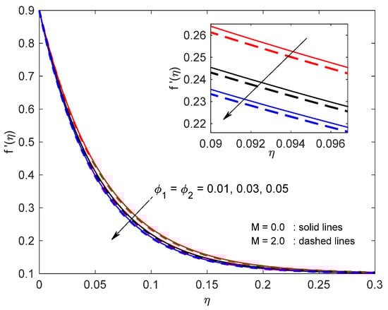 Behavior of f’(η) with respect to the volume fraction parameters ϕ1 and ϕ2 and magnetic field M.