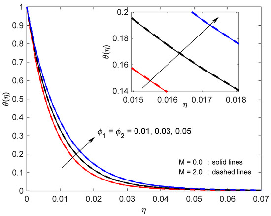 Behavior of θ(η) with respect to the volume fraction parameters ϕ1 and ϕ2 and magnetic field M.