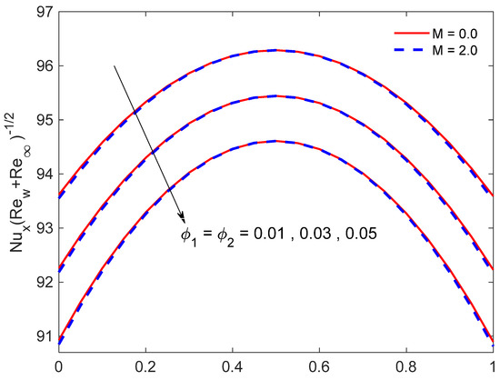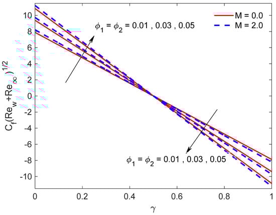 Figure 6, Figure 7, Figure 8, Figure 9, Figure 10, Figure 11, Figure 12, Figure 13, Figure 14 and Figure 15 elucidate the influence of the volume fraction parameters ϕ1 and ϕ2 and suction parameter fw, and on the outlines of velocity f’(η), temperature outline θ(η), local skin friction coefficient and local Nusselt number , respectively, for several values of velocity ratio parameter γ in the range 0 ≤ γ ≤ 1. It is seen from Figure 6 and Figure 7 that the velocity ratio parameter γ = 0, 0 < γ < 1, and γ = 1 indicates a fixed surface in a moving hybrid nanofluid, moving surface in a moving fluid, and a moving surface in a quiescent fluid, respectively. However, it is evident from Figure 8 that an intensification in the magnitude of suction parameter (fw >> 0) leads to a decline in the flow near the surface, which causes a decline in both the velocity outline and momentum boundary layers for γ > 0.5. Figure 9 also discloses that the prominent intensification in the values of fw trends to an apparent decline in the temperature outline and its boundary layer thickness of the hybrid nanofluid. Moreover, it is witnessed from Figure 10 and Figure 11 that, as the volume fraction parameters ϕ1 and ϕ2 increase, the velocity outline minifies for γ > 0.5. Furthermore, both the temperature outline and thermal boundary layers promote continuously with the growth in the ϕ1 and ϕ2. This fact is inferred, as the volume fraction of copper and alumina increases the thermal conductivity and, hence, the thermal boundary layer thickness escalates. As exhibited in Figure 12, it is witnessed from the figures that all values of the skin friction coefficient are positive as γ < 0.5 and negative as γ > 0.5, whereas γ = 0.5 achieves = 0, since both the hybrid nanofluid and the plate move with the same velocity. Conversely, the local Nusselt number is positive for all γ. Moreover, it is clear from Figure 12 and Figure 13 that enhancing the suction parameter fw yields an improvement in the skin friction coefficient , whilst the opposite behavior is noticed for γ > 0.5. It is also clearly evident that a considerable enhancing of the fw produces an improvement in the local Nusselt number for all γ. These patterns are related to the obvious decline in the thermal boundary layers as fw enhances. In addition, it is uncovered from Figure 14 that the augmentation in the volume fraction parameters ϕ1 and ϕ2 has a tendency to diminish the as a result of enhancement in the momentum boundary layer thickness for γ > 0.5 and, conversely, an impact is uncovered for γ < 0.5. However, as indicated, above that, the augmentation in ϕ1 and ϕ2 reveals an enhancement in both the temperature outlines and its boundary layers. This causes a reduction in the Nusselt number, as shown in Figure 15. These may be due to the sensitivity of thermal boundary layer thickness with ϕ1 and ϕ2 concerning the evolution of thermal conductivity of nanofluids (see Table 5), which results, in turn, in an increment in the thermal diffusivity and, therefore, based on Equation (14), they yield a sufficient decline in the Nusselt number. The impacts of magnetic field M, Eckert number Ec, and Casson factor β on the outlines of velocity f′(η) and temperature θ(η), skin friction coefficient and Nusselt number are shown in Figure 10 and Figure 11 through Figure 16, Figure 17, Figure 18 and Figure 19. It is seen also from Figure 10 that the effect of M brings down the hybrid nanofluid velocity. This is because, if the value of M magnifies, a resistive force, such as a strain intensity, obverse to fluid movement is generated, which is known as Lorentz intensity. The conduct of Lorentz intensity has a tendency to slow down the velocity and boundary layer thickness. Figure 11 sketches the deviation in the temperature profile with different values of M for Casson hybrid nanofluids. It is noticed that the fluid temperature enlarges inconsiderably with greater magnetic value, since extra work is performed by the fluid in overcoming the drag force, which is then dissipated as thermal energy. Hence, the magnetic field serves to accelerate the temperature of hybrid nanofluid. In Figure 16 and Figure 17, the effect of Eckert number Ec on the velocity and temperature curves is plotted. Ec represents the ratio of kinetic energy of the flow to the boundary layer enthalpy variations. It explains the transformation of kinetic energy inside the inner power via work carried out versus the stresses of viscous fluid. An Eckert number in positive values means cooling of the surface, i.e., absence of heat from the moving surface to the hybrid nanofluid. Therefore, larger viscous dissipative heat yields an enhancement in the temperature curves. Hence, it is easy to notice that, for the elevation in the values of Ec, both the velocity and temperature profiles boost. Moreover, it is seen from Figure 16 and Figure 17 that increasing β leads to a reduction in both the velocity and the temperature curves. Physically, increasing values of Casson parameter β yields an enhancement in the dynamic viscosity of the fluid, which causes a decrease in the nanofluid motion; due to this, the decline in momentum boundary layer thickness and slight decrease in thermal boundary layer thickness are noted. Moreover, Figure 15 and Figure 19 expresses that both the magnetic parameter 𝑀 and Eckert number Ec have caused a decline behavior in the Nusselt number. As these two parameters declined the velocity profiles, that is why its skin friction coefficient also has the same pattern for their greater values for γ > 0.5. Finally, Figure 18 and Figure 19 characterize the alteration of the skin friction coefficient and Nusselt number with various values for Casson parameter β. It is evident from these Figures that the surface friction coefficient decreases with rising values of β, as expected for all γ, and, conversely, an impact is uncovered for the local Nusselt n