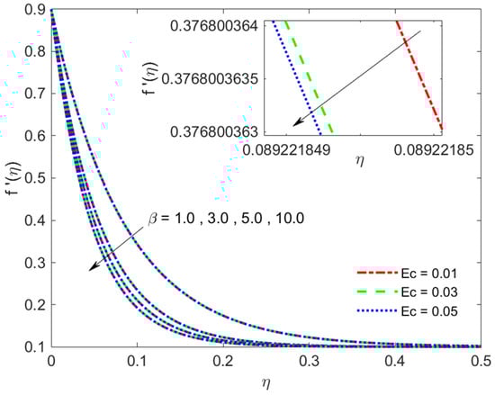 Behavior of f’(η) with respect to Casson parameter β and Eckert number Ec.