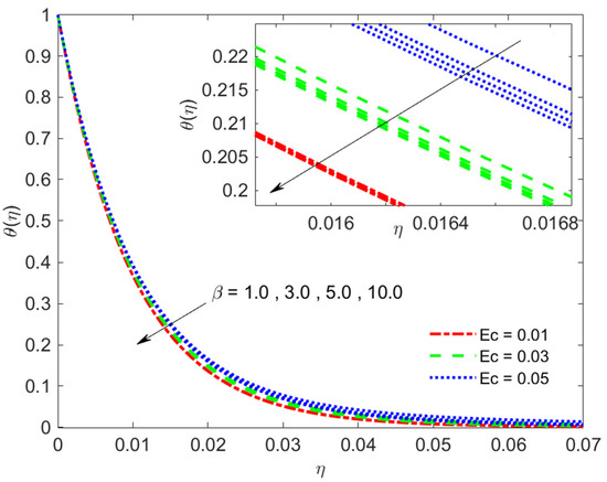 Behavior of θ(η) with respect to Casson parameter β and Eckert number Ec.