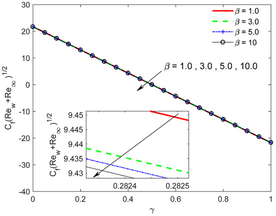 The present section of this research addresses the impacts of several dimensionless parameters on the hydro-magnetic flow of Casson hybrid nanofluid (Cu/Al2O3-water) streaming over a permeable moving/fixed surface. Figure 6, Figure 7, Figure 8, Figure 9, Figure 10, Figure 11, Figure 12, Figure 13, Figure 14, Figure 15, Figure 16, Figure 17, Figure 18 and Figure 19 are sketched to manifest the response of varying Casson factor β (=1–10), magnetic field parameter M (=0.0–2.0), suction parameter fw (=20–60), Eckert number Ec (=0.01–0.05), and solid fraction parameters ϕ1 and ϕ2 (=0.01–0.05) on the outlines of velocity f’(η), temperature θ(η), skin friction coefficient , and Nusselt number , with various different values of velocity ratio parameter γ (0 ≤ γ ≤ 1).