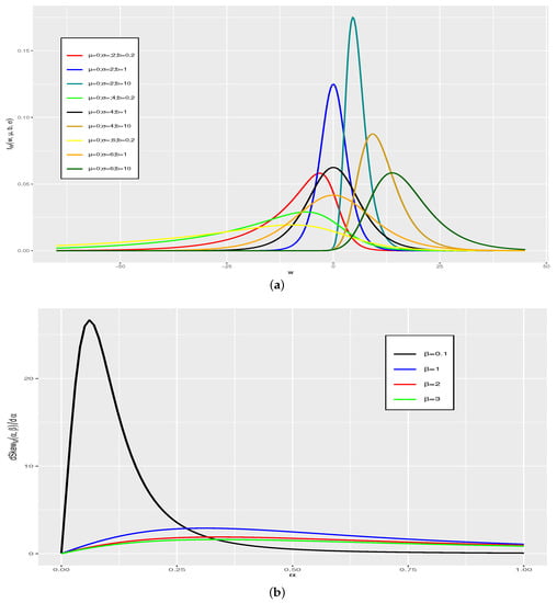 with , , and “e” denoting the exponential function. The family of IGL distributions consists of members with their positively skewed PDF and coefficient of kurtosis greater than that of the logistic distribution. If W is an IGL distributed random variable, then has a type II generalized logistic (IIGL) distribution []. Additional generalizations of the logistic distribution are discussed in []. For , the distribution is symmetric, for , it is skewed to the left (negative asymmetry), and for , it is skewed to the right (positive asymmetry).