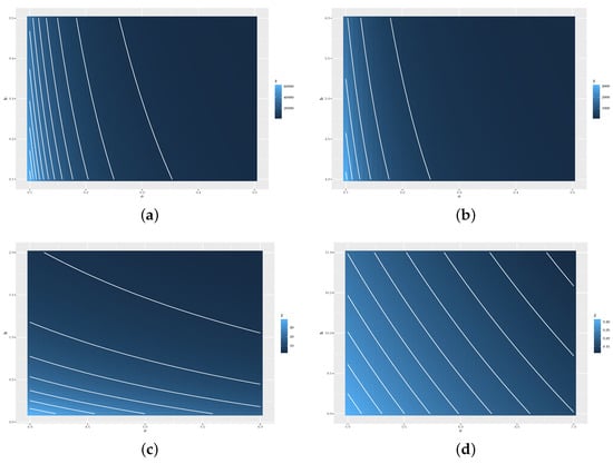 where is defined with the elements given in (12), and . We observe that the behavior of the Jeffreys prior depends only on . In Figure 2, we show the behavior of on the subspace of , say , highlighting four region: (a) ; (b) ; (c) ; and (d) . Thus, in general, note that the PDF of a Jeffreys prior takes extreme values when the scale parameter () is close to the origin and in greater degree when the shape (b) is close to the origin (see Figure 3a,b, respectively). Whereas if we move away from it (see Figure 3c,d), the Jeffreys prior PDF (in this figure denoted as z) takes smaller values. This is the reason why it is recommended to use it in cases where empirical asymmetry is positive, that is, , in order to avoid those parts of the domain where the PDF has very strong changes and thus damages the efficiency of the algorithm. The above does not disregard the use of the independent and non-informative priors. To achieve a reasonable rejection rate, these results indicate to us that a Jeffrey priori on the region (c) should be considered.