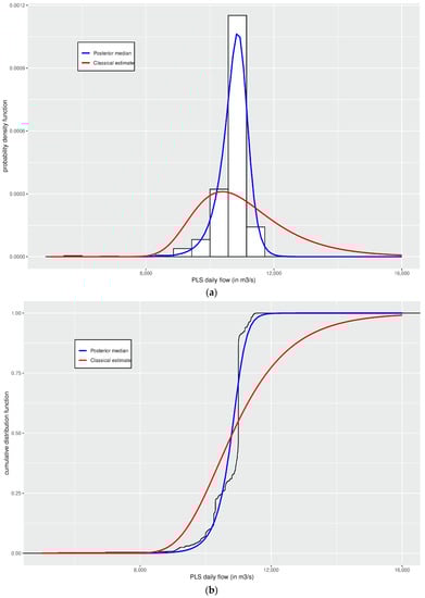 Histogram and fitted PDF (a) and empirical distribution function with fitted cumulative distribution function (b) and parameters estimated via classical and Bayesian methods using PLS daily flow data.