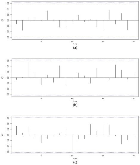 ACF of the chain (a), , (b), and (c) with PLS daily flow data.