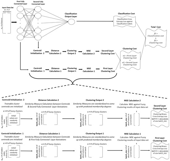 The proposed method consists of two main stages which are pre-training and training. In the pre-training stage, we cluster the dataset using the Fuzzy C-Means algorithm and come up with a matrix that contains the fuzzy membership degrees of each observation to each cluster. Here, the number of fuzzy clusters to choose is a hyperparameter of our method. The resulting fuzzy membership degrees matrix becomes an input to the second main stage of the proposed method. In the training stage, we aim to train a fully connected layer in a way to minimize a combined cost function that includes both classification and clustering costs aggregated in a weighted manner. The weighting between clustering and classification costs is another hyperparameter of our method. As the first step in the training process, a centroid matrix of size , where denotes the number of hidden nodes in the fully connected layer and c denotes the number of fuzzy clusters, is randomly initialized. This matrix holds the cluster centroids in the transformed feature space created by the fully connected layer. These centroids are trainable and they are learned through the backpropagation process. The second step of the training process is to calculate the Euclidian distance between the activation values of the fully connected layer and the cluster centroids for each observation (see Equation (4)). Subsequently, these distances are transformed into predicted fuzzy membership degrees using the standard formula employed by the Fuzzy C-Means algorithm (see Equation (5)). Then, for each observation, the mean squared error (MSE) between these predicted fuzzy membership degrees and the target fuzzy membership degrees computed in the pre-training stage is calculated (see Equation (6)). Afterwards, the clustering cost is obtained as the binary cross entropy loss between the MSE values and a zero vector (see Equation (8)). Here the point is that these MSE values are all expected to be zero so as to get the same clustering structure of observations in the new feature space. Thus, the cross-entropy results against a zero vector are employed as the clustering cost of the fully connected layer. The reason why we use the cross-entropy result rather than the MSE result itself as the clustering cost, is to prevent any possible scale related bias that may happen when averaged with the classification cost. On the other hand, the classification cost is computed in exactly the same manner as the traditional training process of a fully connected layer. As the final step, the total cost on which the backpropagation will be executed is obtained as the weighted average of the classification and clustering costs (see Equation (9)). All these steps of the training stage of the proposed method are visualized in Figure 2 for a single fully connected layer. Also, related computational details are given in Algorithm 1 “Proposed Algorithm for a Single Fully Connected Layer” part below.