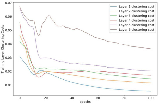 Moreover, in order to observe the change in the clustering cost of each consecutive fully connected layer in multiple layer cases, we conducted another analysis using the “ionosphere” dataset. In this setup, unlike previous experiments, we used six consecutive fully connected layers, each consisting of ten hidden units, to perform the classification task. The number of fuzzy clusters were selected as two for each layer and the clustering cost of each layer was given equal weight in the total clustering cost. Weights of classification and clustering costs in the total cost were determined with a ratio of 9:1. Figure 5 shows an example course of each layer’s clustering cost during a 100-epoch training process.