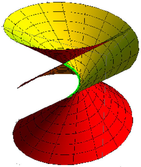 where , and . The parameters h, ψ and can control the shape of the surface . Thus, Equation (41) is a 3-parameter family of Lorentzian unit spheres. The intersection of each Lorentzian unit sphere and the corresponding spacelike plane is a one-parameter family of Euclidean circles Therefore, the envelope of Equation (41) is a one-parameter family of Lorentzian cylinders.