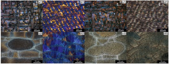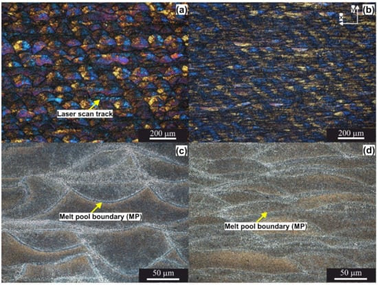 Figure 2(a1,a2) shows the microstructure of the as-built (S0) sample taken in the XY plane, perpendicular to the building direction. The microstructure featured almost symmetrical discontinuous laser scan tracks, which are typical for metallic materials prepared by SLM. The laser scan track boundaries appeared to be more heavily etched and darker than their interiors, where smaller crystals with diverse crystallographic orientations were also visible.