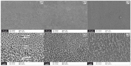 Figure 3(a1,a2) shows the microstructure of the as-built SLM AlSi10Mg sample, examined using secondary electrons. As indicated in the magnified image of the melt pool boundary, the microstructure of the as-built sample was heterogeneous, showing three different zones. These zones were identified as fine (‘MP fine’), coarse (‘MP coarse’), and a heat-affected zone (‘HAZ’). The ‘MP fine’ zone was composed of fine primary α-Al cells (darker gray) surrounded by a continuous cellular Si network (lighter white). The ‘MP coarse’ zone consisted of a coarser Si network, while the ‘HAZ’ consisted of a partially broken Si network.