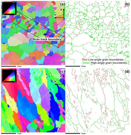 Figure 5c,d presents the inverse pole figure (IPF-Z) orientation and grain boundary maps (representing the XZ plane) for the same sample. The EBSD result shows that the microstructure was composed of columnar grains, Figure 5c, with an average grain size of approximately 10.1 µm. Such a grain morphology is typical for the side plane of SLM-fabricated samples and results from the boundaries of the epitaxial growth from the molten pool [37]. According to the grain boundary map, Figure 5d, the side (XZ) plane contained a large fraction of LABs than the building (XY) plane (~27% of the total grain boundaries).