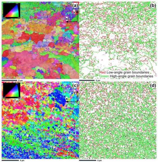 Figure 6 shows the inverse pole figure (IPF-Z) orientation and grain boundary maps of the ECAP processed samples. In these maps, to reduce the influence of noise on the data, crystallites smaller than or equal to four map pixels were ignored. As is visible, the first ECAP pass caused significant modification of the microstructure. Referring to Figure 6a, the microstructure became more homogeneous and finer. The fraction of low-angle boundaries (LAGBs) increased to ~29.2%. At the same time, the average grain size decreased to 1.425 µm. The second ECAP pass brought significant progress in grain refinement, shown in Figure 6c,d. It appears that the cell boundaries acted as additional obstacles for mobile dislocation; therefore, with the progressive increase in the number of ECAP pressings, these cells formed subgrains. Consequently, the fraction of grains that had low angle misorientation decreased slightly to 19.32%, and the grain size was further reduced from 1.42 to 0.25 µm.