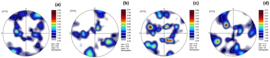 (111) pole figures of AlSi10Mg alloy (a) heat-treated XY plane, (b) heat-treated XZ plane, (c) heat-treated + 1 ECAP pass, (d) heat-treated + 2 ECAP passes.