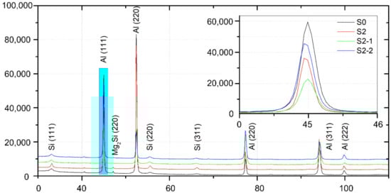 Figure 8 shows the full XRD patterns corresponding to each investigated condition. In these patterns, we identified the main reflections, which corresponded to the Fcc Al, diamond cubic Si, and cubic Mg2Si phases. As can be observed, the Si peaks for the heat-treated S2 sample had higher intensities than those of the as-built S0 sample, which means that the heat-treatment period was long enough to initiate the precipitation of excess Si from the Al matrix, thus decreasing the Si content in the solid solution. This accordingly caused a lattice parameter increase from 4.0495 ± 0.0004 Å (S0 sample) to a more equilibrium value of 4.0509 ± 0.0003 Å (S2 sample), which for Al in AlSi10Mg alloys is reported to be 4.0515 Å [40]. The inset in Figure 8 illustrates the shift of the Al (100) reflection toward the lower 2θ angles, suggested the minor variations in the Al lattice parameter after ECAP. In fact, the calculated Al lattice parameter of the S2-1 sample decreased to 4.0476 ± 0.0003 Å; however, it increased slightly to 4.0502 ± 0.0003 Å after the second ECAP pass (S2-2 sample), which indicated variations in the Si solid solubility during ECAP processing.