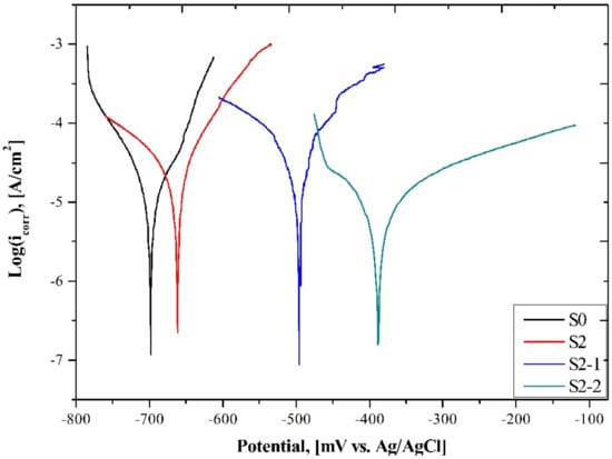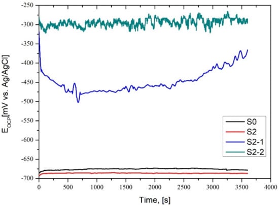 The typical electrode potential (Eocp) as a function of immersion time in a 3.5% NaCl solution for the as-built, heat-treated and ECAP processed samples are presented in Figure 9. As can be seen, the stabilized Eocp values for the S0 and S2 samples were much lower (~–670 mV, and −685 mV, respectively) than for ECAP processed S2-1 (~–0.760 mV) and S2-2 samples (~–0.870 mV). Generally, the open circuit potential Eocp reflects the thermodynamic parameter, which guides us about the thermodynamic tendency of metallic materials to participate in electrochemical corrosion with the electrolyte or neighboring medium. A decrease in Eocp values with the subsequent stabilization indicate possible dissolution of the material surface, whereas an increase in the Eocp values with subsequent stabilization indicates an increased compactness of the passive layer and/or growth of corrosion products on the samples’ surfaces. The recorded Eocp values for the four tested samples belonged to the passive region domain of Al(OH)3 or Al2O3 in the Pourbaix diagram for aluminum [43], which indicated the formation of a Al(OH)3 or Al2O3 passive layer on the sample surface. Accordingly, the higher Eocp values for the ECAP processed samples indicated their higher corrosion resistance, which is due to the possibility of a more effective formation of the oxide layer from the corrosion product and, in effect, the passivation process.