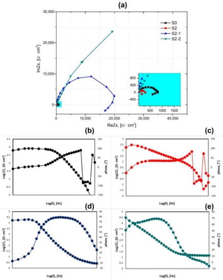 Nyquist (a) and Bode plots (b–e) of analyzed samples.