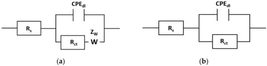 The mathematical impedance models of both ECMs are presented in Equations (2) and (3). The resistances of the electrolyte solution were comparable for all samples (~4 Ω).