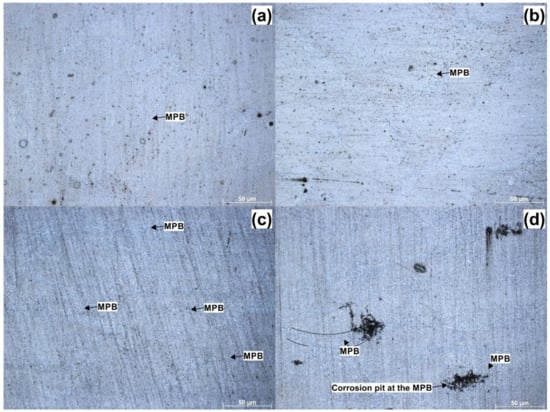 Figure 13a,b shows the representative light microscopy images of the corroded surfaces for the S0 and S2 samples. Multiple holes formed as a result of pit development. A qualitative analysis of both surfaces after anodic polarization tests revealed more intensive pitting along the melt pool boundary (MPB), which confirmed previous assumptions that the melt pool boundaries acted as weakened zones during corrosion [54]. The corrosion morphologies of the S0 and S2 samples were very similar, although for the S0 sample, more pits were recorded for the analyzed area.