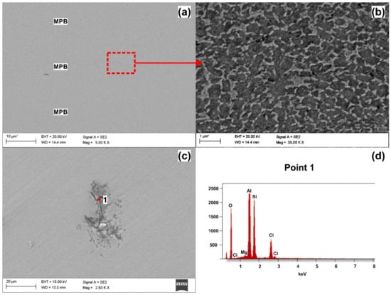 Several references [57,58] indicated that such particles stimulate α-Al corrosion since they produce local galvanic couples. In fact, a higher magnification (Figure 14c) revealed localized corrosion at the interface between the Si/α-Al interface. The results of the SEM/EDX analyses (Figure 14d) confirmed that the corrosion pits were located at the melt pool boundaries, where the coarser Si particles are exposed to the corrosive environment.