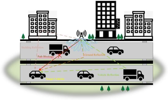 Let us consider a typical vehicle to infrastructure (V2I) communication scenario as shown in Figure 1, where the base stations (BSs) with low heights are deployed on both sides of the urban road and the vehicles, consisting of small cars and large trucks, are randomly distributed. The line of sight (LOS) path from the vehicle to the BS may be obscured due to the presence of a large number of vehicles with different sizes and motion states []. In addition, various objects distributed on both sides of urban roads can reflect electromagnetic waves, forming none-LOS paths (NLOSs). We treat ground buildings or other roadside structures as static reflectors, and vehicles, moving bicycles and the moving crowd on the road as mobile reflectors []. In this paper, we do not consider the effects of bicycles and the crowd with low heights or marginal locations. The location, size and type of vehicles can be tracked by the sensors.