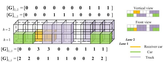 Considering the V2I communication scenario established in Section 2, there are three types of vehicles in the grid: adjacent trucks, adjacent cars, and cars where the receivers are located. We define the number of lanes as l and the height of the simulated area as h, where , and . In order to facilitate the operation, we restrict the height of the car into a grid with and the truck into the grid with or . An illustration of 3D encoding of the occupancy grid is shown in Figure 2. If there are no vehicles in the g-th grid of the l-th lane, we set ; If the grid is occupied by a truck, we set , where ; If the grid is occupied by a car (excluding the car with the receiver), we have and . If a car equipped with a receiver is in a grid, we have and , because the receiver is installed in a small car with a low height. The environmental coding model can be expressed as: