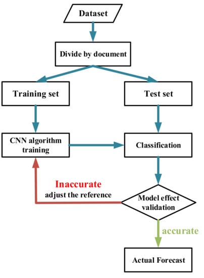 We propose a new CNN-based beam selection strategy, which can be divided into two main stages; the training stage and the prediction stage. The specific process, as shown in Figure 4, is in the training stage, where the beam is trained by dividing the dataset into a training set and a test set. The division ratio used in this paper is 80% for the training set and 20% for the test set. We train the classifier with the training set and verify the performance of the DL model using the test set []. Finally, by optimizing the parameters, we can obtain a well-trained DL model. In the actual prediction stage, the trained DL model is used to classify and predict the beams in a real scene to achieve the best beam pair. After finishing the work of the two stages, the obtained training model is used for actual beam selection. Note that the difficulty of the proposed algorithm implementation is mainly dependent on BPI optimization for the corresponding environmental features.