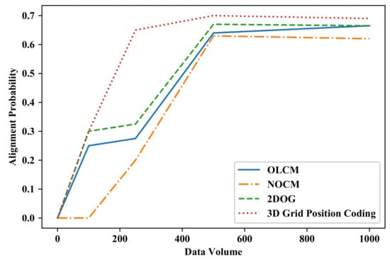 The alignment probabilities of these methods with the same CNN model are shown in Figure 5. We can see that the 3D grid coding method achieves the best performance in terms of the alignment probability by comparing with the other typical methods. This is because our proposed method orders the location features based on the positions, heights, and lanes of all vehicles in the target scene, taking into account the influence of neighboring vehicles. It is worth mentioning that when the amount of sampling data is small, the performance of the 3D grid coding method is still excellent and the growth rate is relatively smooth. This indicates that the CNN model trained by 3D grid coding can deal with the dataset disequilibrium well even with a relatively small data size.