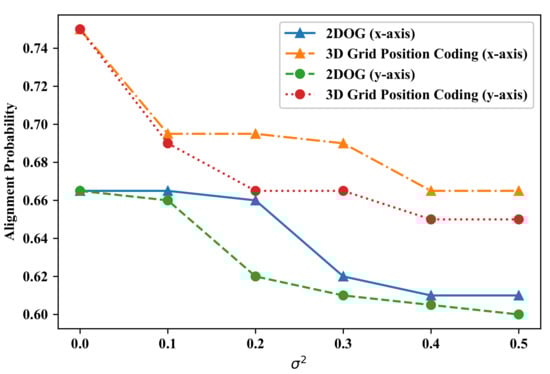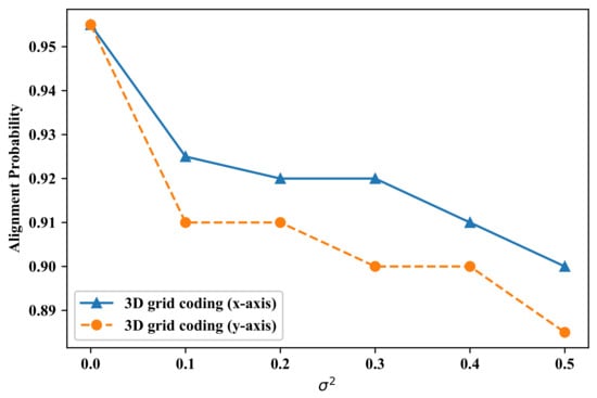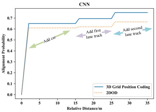 The comparison of alignment probabilities at different positioning accuracy levels with the CNN model is shown in Figure 6. We can see that inaccurate coordinate positions have a large impact on the prediction accuracy. The error in the y-axis has a greater impact on alignment probability, since the error in the y-axis represents the deviation of the lane. The simulation results also prove that the CNN-trained model with 3D grid coding has better performance than typical 2DOG. Therefore, our proposed method has good immunity to positioning errors provided by different sensors.