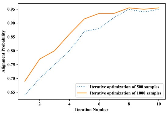 Figure 8 shows the performance of the proposed iterative optimization method for labeled data in this paper. As mentioned above, CNN-based beam searching is a kind of supervised machine learning method, and the correctness of the label data becomes the core element affecting the accuracy of the search results. It can be seen that the performance of alignment probability obtained by using our iteratively optimized label-data is significantly better than that by using only theoretical label-data. The simulation result also shows that after several iterations of optimization, the curve of alignment probability tends to be stable and can achieve a satisfactory result of nearly 95%.