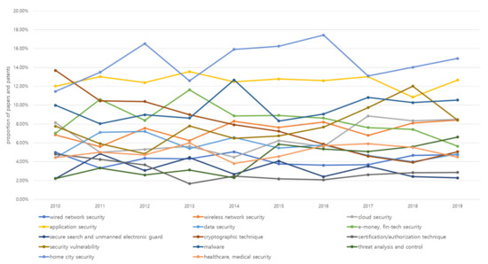 | Security Fields | Number of Papers and Patents in Last Year (2019) | Average Number of Papers and Patents | Paper and Patent CAGR (Number) | Average Proportion of Papers and Patents | Paper and Patent CAGR (Proportion) |