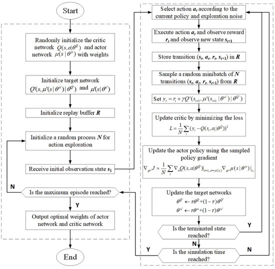 The purpose of reinforcement learning is to obtain the agent that contains a policy πθ maximizing the cumulative reward defined in Equation (10) by interacting with the environment. The procedure of training the agent with DDPG is shown in Figure 2.