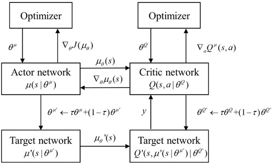 In this procedure, the DDPG algorithm trains the agent with the actor–critic framework shown in Figure 3. Both critic and actor combine two neural networks: the estimation network, and the target network. The four neural networks are denoted as , , , and , with weights , , , and , respectively.