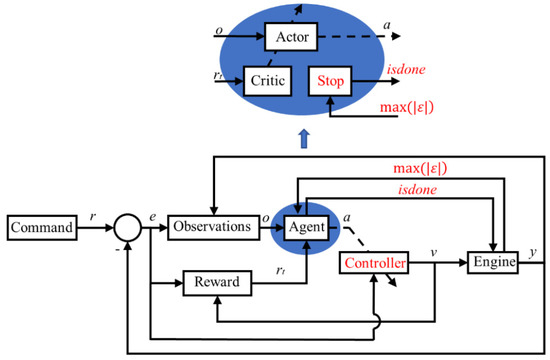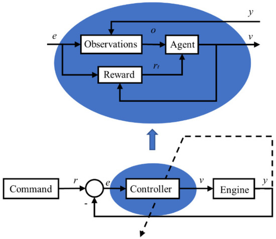 The simplest structure of a closed-loop output feedback control system is shown in Figure 5. In order to implement transient control with a reinforcement learning method with the set command and control values above, the controller module is replaced with observations, reward, and agent modules.