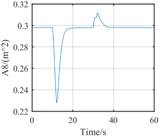 The performance of the system with the RLPI controller is validated with the step response of acceleration from idle to intermediate and deceleration from intermediate to idle. Meanwhile, the reinforcement learning design method is only applied to the fuel flow control loop, with the purpose of minimizing the disturbance. Parameters of the nozzle area are shown in Figure 7. As mentioned in Section 2, the uncertainties of the actuators result from the order uncertainty or the dynamic uncertainty. In this section, the time constant of the actuator is changed from 0.1 to 0.2. Simulation results are shown in Figure 8 and Table 2. It is illustrated in Figure 8 that the controllers have the ability to track the command with a settling time of no more than 3.8 s and overshooting by no more than 1.5% when , which are defined as ideal conditions. The performances are very close to one another when the time constant of the actuator changes. This means that when the uncertainties of the actuator exist, the RLPI controller still maintains the performance of the closed-loop system. It is illustrated in Table 3 that the settling time changes by no more than 0.7 s and the overshooting increases by 0.73% when the time constant of the actuator increases.