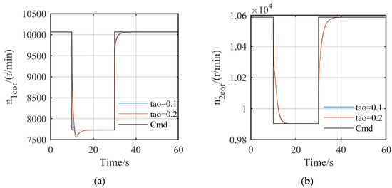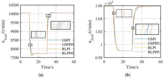 Response of corrected rotor speed with RLPI controllers with different time constants: (a) Comparison of n1cor response. (b) Comparison of n2cor response.