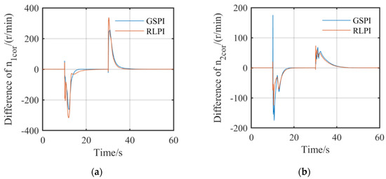 Difference in corrected rotor speed control performance with GSPI and RLPI controllers before and after degradation: (a) Difference in n1cor control performance before and after degradation. (b) Difference in n2cor control performance before and after degradation.