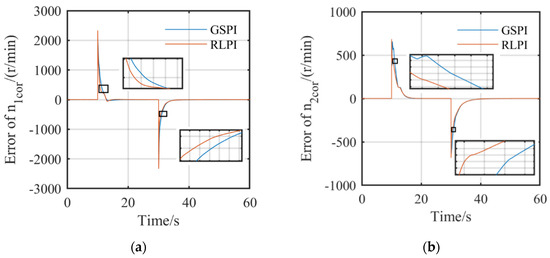Corrected rotor speed error with GSPI and RLPI controllers when degradation takes place: (a) Comparison of n1cor response error. (b) Comparison of n2cor response error.