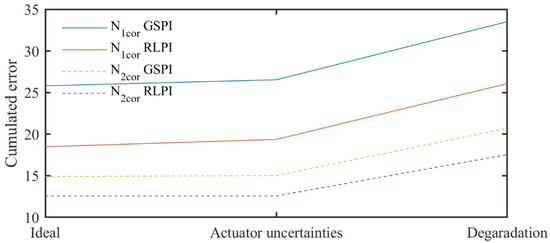 where ncmd is the command. The results show that the cumulative error of both GSPI and RLPI increases, but the cumulative error of RLPI is much better. For n1cor, the performance of the turbofan controlled with the RLPI controller after degradation is almost equal to the performance of the turbofan controlled with the GSPI controller before degradation.