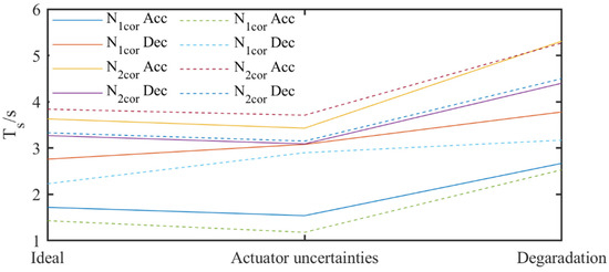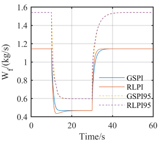 In this section, the degradation is simulated by reducing the compressor efficiency by 5%. Simulation results are shown in Figure 9, Figure 10 and Figure 11 and Table 3. It can be concluded that the transient performance of the system decreases when the efficiency of the compressor decreases for both deceleration and acceleration processes compared with ideal conditions. It is shown in Figure 10 that the maximum difference in n1cor is about 300 r/min and the maximum difference in n2cor is about 100 r/min. The n1cor change with GSPI is smaller than that with RLPI, and the n2or change with RLPI is smaller than that with GSPI. Moreover, it is shown in Figure 9 that the response of the corrected rotor speed is smoother with RLPI, due to the nonlinearity of RLPI. The transient process with RLPI also has faster transient response and smaller transient error.