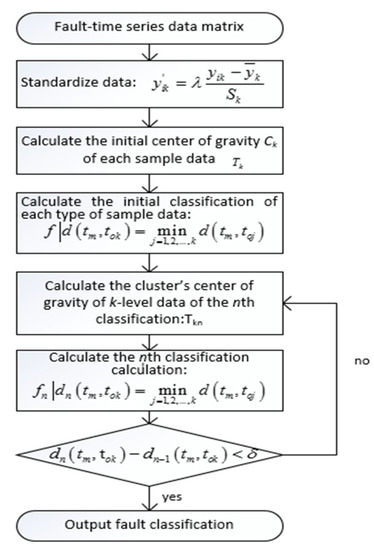 Where was the weight coefficient of the fault–time series matrix, and was the conditions for termination of the model operation, the fault–time series matrix data are used as an input that is standardized later in the following process. In the next process, initial center of gravity Ck from each sample data is calculated. Based on the calculated initial center of gravity Ck of each sample data, the classification of each type of sample data is performed. The proposed model is well-established to determine the cluster center of gravity of k-level data, and the nth classification in processes 4 and 5, respectively. If the proposed model meets termination conditions, we receive classified fault data of turbines; otherwise, it returns to calculate Tkn at process 4 of the proposed model.