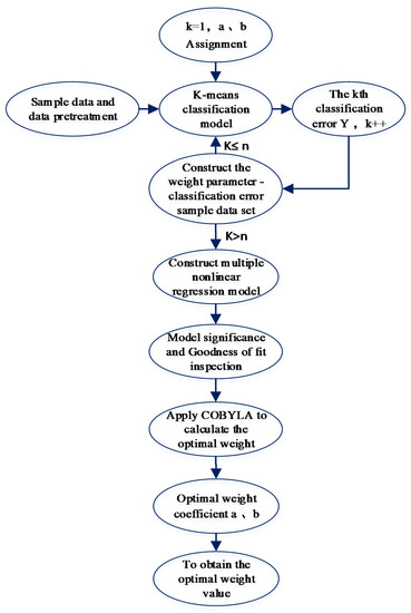 In terms of the combined nonlinear regression model constructed for the weight coefficients of the classification model, its weight parameter optimization algorithm was implemented by using the “constrained optimization by linear approximation” (COBYLA) algorithm [35]. First, the data were collected and standardized, and the K-means model was used to construct the sample dataset of weight parameters-classification error. Then, a multivariate nonlinear regression model was completed through the sample dataset; finally, the COBYLA algorithm was used to solve the optimal weight coefficient, and the optimal dynamic weight value of each column was obtained. The calculation process flow is shown in Figure 3: