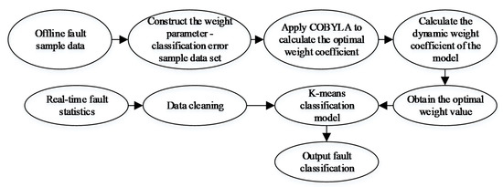 By incorporating newly added fault data into the fault sample data, we can accumulate the sample data for the next evaluation update of the optimal weight coefficient. The application and process of wind farm fault classification model in wind power industry are shown in Figure 4:
