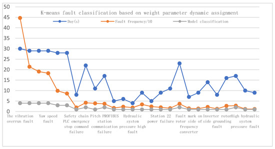However, studies based on K-means clustering only consider the optimization of clustering center and K value selection [19], ignoring the optimization and dynamic allocation of attribute weighting parameters. Therefore, based on the existing four-level fault processing system of enterprises, this paper combines the linear approximate constraint optimization strategy with the nonlinear regression theory, establishes a dynamic weighted K-means fault clustering classification model based on the weight parameter optimization algorithm, and realizes automatic fault classification processing based on fault time distribution, so as to quickly identify the common faults and key faults of a wind power base, tower, and unit.