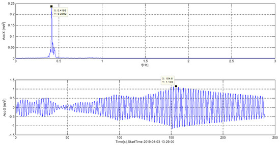 Among those faults, the vibration overrun fault is listed as the fourth-level fault in the model, which needs to be handled by the research institute. According to the statistical data for wind field faults, it is found that this fault occurred 447 times in the mentioned time, of which there were 193 occurrences in Unit 10. According to the 254 vibration overrun faults triggered by batch units, through the analysis of its operational data, it was found that this fault always occurred in the low wind speed areas where wind turbines did not generate electricity. The vibration overrun faults have been considered of the severe category of the problem [38]. The analysis of the acceleration spectrum of other unit system data shows that the resonance frequency is 0.4167 Hz, which is consistent with the previous study by Huang [39] where the measured frequency and amplitude were 0.5502 Hz and 0.09141 m/s2, respectively. These findings were consistent and symmetrical with the natural frequency of the tower and the blade passing frequency (3 P). As a result, the forced oscillation causes the tower to resonate and then triggers the rotating speed to excite the tower vibration fault, as shown in Figure 6. Finally, the wind power company optimizes the control strategy of the small wind speed stages of wind turbines to solve the faults of batch wind turbines.