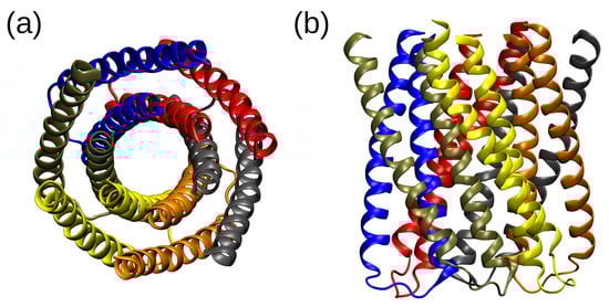 Experimental structure of TMHC6 hexamer with 12-fold helical symmetry: (a) view from the top along the channel axis, (b) side view. On the basis of the 6TMS PDB deposit [].