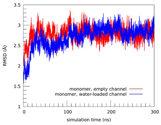Efficient process of self-assembly of the artificial TMHC6 protein into a 6-chain, 12-helix channel structure is undoubtedly a sign of a successful molecular design, possible with contemporary molecular modeling tools. On the other hand, the protein was designed to reside in a membrane; however, it was found to be stable in the water environment also []. Taking into account the experimental findings, we investigated the details of the protein stability using the classical molecular dynamics (MD) computational approach. The method provides a description of the whole protein with the empty channel, as well as its water-loaded form in the channel. The hexameric bundle systems (empty channel and water-loaded channel) were investigated, using the experimental X-ray structure of 2.70 Å resolution as the starting point []. The obtained trajectories were analyzed based on diverse post-processing estimators. Immediate assessment of the structure stability was provided by the root mean square deviation (RMSD) of the protein backbone with reference to the initial structure []. The time evolution of two monomeric protein models is presented in Figure 2. As it is shown, the RMSD value fluctuated for ca. 100 ns in both cases. We have observed that, after the initial rapid growth phase (less than 50 ns), for the next 50 ns, the RMSD value decreased and increased, finally reaching a stable level, and oscillated around ca. 2.8 Å for both monomers. The RMSD graphs show that the difference between the models with initially empty or initially water-loaded channels is negligible. The empty channel was not totally filled with water molecules within the analyzed time scale. The central pore was filled only at the wider entrances, specifically—from the cationic cavity containing the lysine (K) ring—the water molecules have not proceeded further beyond the K-ring. Therefore, we can suspect that the presence of water molecules inside the channel does not affect the structure stability of the protein (this will be further verified using more structural estimators). Moreover, the stability of the protein in the monomeric form in the water environment is conserved within the 300 ns MD simulation time.