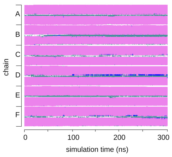 Secondary structure timeline for the monomeric protein model with water-loaded channel (consisting of six chains A–F, each composed of two helices). Color coding: purple— helix; turquoise—turn; blue—310 helix; white—random coil.
